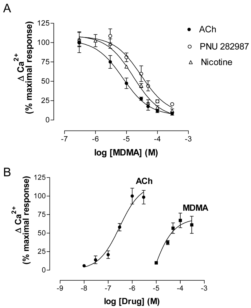 MDMA acutely inhibited the effects of nAChR agonists (ACh, Nicotine and PNU 282987) (Figure 8A) but, when applied alone at low micromolar concentrations, induced a concentration-dependent increase in Ca2+. The effect of MDMA did not reach the maximum values induced by ACh, which indicates a partial agonist mode of action (Figure 8). The EC50 value was around 45 μM, which is in agreement with previous binding results.