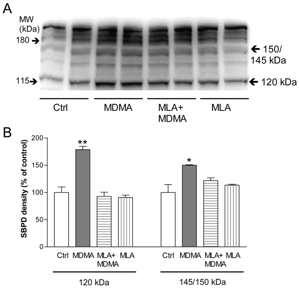 Incubation of PC12 cells with MDMA for 24 h induced a significant increase in spectrin breakdown products (SBDP) of 145 and 150 kDa, which indicates calpain activation, and a rise in the 120 kDa band that, together with the increase in the 150 kDa SBDP, points to caspase 3 activation (Figure 9). Moreover, the increases in SBDP induced by MDMA were prevented by MLA, indicating that α7 nAChR play a key role in this process.