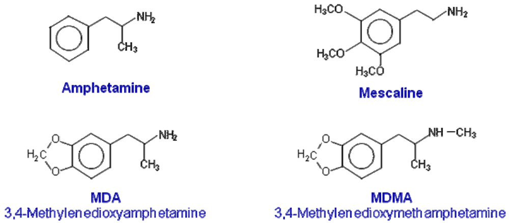 3,4-Methylenedioxymethamphetamine (MDMA or ecstasy) is a phenylpropanolamine with structural similarities to both amphetamine and mescaline (Figure 1). Ecstasy has come to symbolize one of the largest youth subcultures of the late 20th century and has established itself as one of the most popular recreational drugs of abuse [1,2]. The appeal of MDMA is related to its unique profile of psychotropic actions, which includes amphetamine-like stimulant effects, coupled with feelings of increased emotional sensitivity and closeness to others [3-9]. Based on this, Nichols [10] postulated that MDMA represents a novel class of compound, in that it possesses unique effects, which means that it cannot be classified as either a hallucinogen or a psychostimulant. Nichols [10] proposed the term “Entactogen” to describe the effects of MDMA and related compounds. This definition is based on the claimed ability of MDMA to allow therapists and patients to access and deal with repressed painful emotional issues [11]. Due to these unique psychological effects, although never marketed for this purpose, MDMA was used in the 70s and 80s by U.S. psychotherapists [4]. Nevertheless, concern over its increasing abuse and its possible neurotoxicity in humans led to the assignment of MDMA as a Schedule I agent by the U.S. Drug Enforcement Agency in 1985 [12]. Since then, there have been ongoing controversies regarding whether MDMA is medically useful as an adjunct in psychotherapy [13-17] and whether the neurotoxic findings seen after single or repeated high doses of MDMA in experimental animals are relevant for humans [18-23].