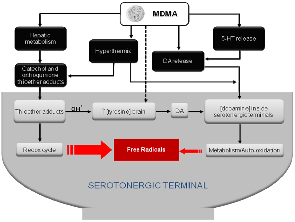 Several studies suggest the involvement of oxidative stress in the mechanism of MDMA neurotoxicity. For instance, the administration of free radical scavengers and antioxidants such as phenylbutylnitrone, ascorbate and α-lipoic acid attenuates the serotonergic deficits induced by the drug [135-137]. Supporting these evidences is the fact that enhancing neuronal anti-oxidative defense by acetyl-L-carnitine prevents the decrease of 5-HT levels in several regions of the rat brain after MDMA administration [138]. In addition, the antioxidant and glutathione precursor N-acetylcysteine also prevented in vitro thioether MDMA metabolite-induced neuronal death [139].