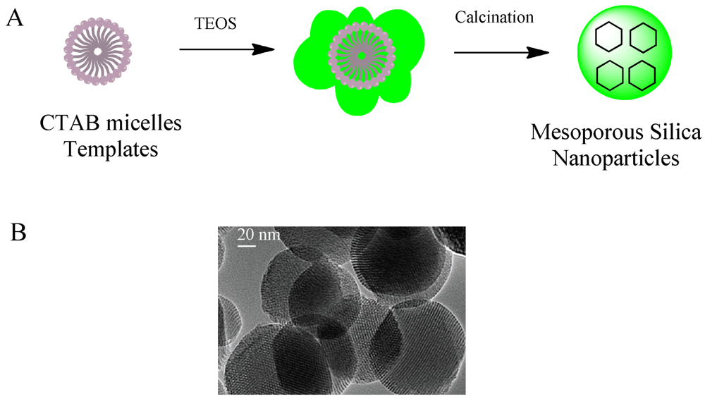 Mesoporous silica nanoparticles have been excellent candidates that fulfill many of the requirements for targeted and controlled drug delivery since they have been proposed as a drug delivery system [17]. They are well-defined nanostructures synthesized through a sol-gel procedure (Figure 1).
