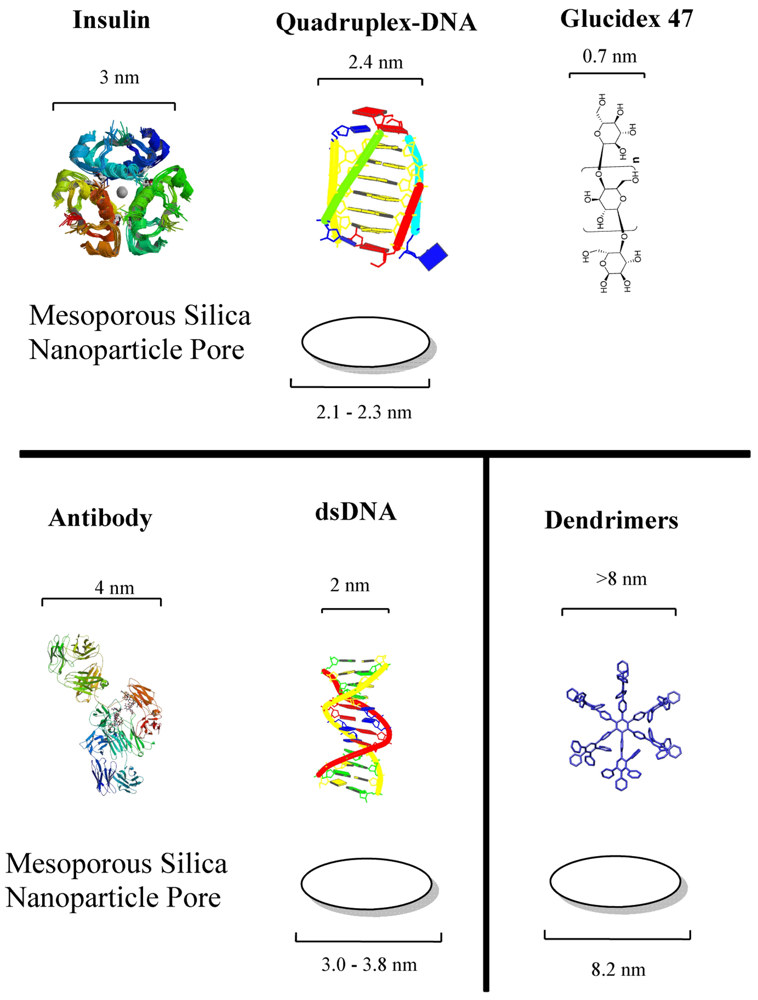 Drug loading properties and easy immobilization of biomolecules on the surface can be mentioned as the two main advantages. They are known for their ordered structures and high loading capacity. Mesoporous silica possess present convenient properties for the development of drug delivery systems. In fact, the majority of stimulus-responsive nanocomposites involve mesoporous silica nanoparticles. Detailed review articles devoted entirely to mesoporous silica or the drug delivery applications of mesoporous silica can be found elsewhere [18,19]. Different drug molecules have been shown to be trapped inside nanoporous materials, capped for stable delivery and release through a trigger mechanism. The internal cavities of nanoporous materials provide safe microenvironments for drugs that can be loaded and protected from degradation during transport. The stability of drug-loaded mesoporous particles is usually achieved through blocking the pore mouths, termed as “capping”. There exist two kinds of capping material with properties designed for targeting or stimuli-responsive releasing requirements. Hard caps are materials such as iron oxide [20], cadmium sulfide [21] or gold nanoparticles [22]. Soft caps include organic molecules, biomolecules and supramolecular structures. The cap material is usually selected at a size that can match the pore size since the main purpose of the cap is to prevent the leaching of drug as much as possible. Biomolecule-based caps were developed for specialized task and enzymes [23,24], sugars [25,26], antibodies [27] and nucleic acids [28] are among the types of molecules. Figure 2 shows the dimensions of examples of biomolecules used for capping the corresponding pore sizes of mesoporous silica.