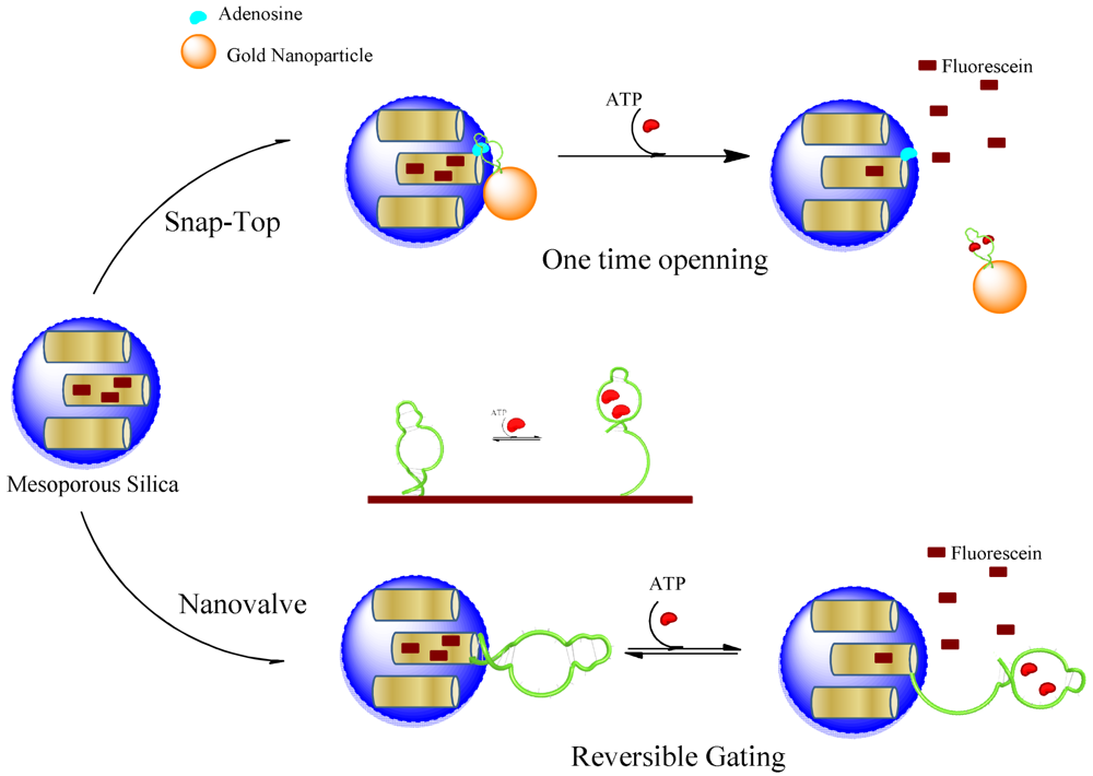 A novel stimulus-responsive drug delivery system was recently developed by using aptamer-target interactions [100]. Mesoporous silica nanoparticles were capped with gold (Au) nanoparticles which are linked to the surface of silica through an aptamer sequence binding its target immobilized on the surface of nanoparticles. By competitive displacement, Au particles were uncapped in the presence of trigger molecule ATP and the guest molecules are released (Figure 4). In this work, the solid MCM-41 nanoparticles were functionalized at the-NH2 group and a derivative of the ATP molecule (adenosine-50-carboxylic acid, denoted as adenosine-COOH) was immobilized on the outer surface of the MS through an amidation reaction. Meanwhile, Au nanoparticles (AuNPs) were functionalized with ATP aptamer through Au-S bonds. ATP aptamer recognizes the adenine and ribose moieties, when mixing AuNPs-aptamer with adenosine modified MCM particles. AuNPs would be capped on the pores of nanoparticles, owing to the binding reaction of ATP aptamer with adenosine. The release of the guest molecule could be triggered by challenge with ATP molecules. The addition of ATP resulted in a competitive displacement reaction. Therefore, the developed aptamer-based delivery system encapsulates cargo molecules, and delivers the content when encounters an environment with ATP molecules.