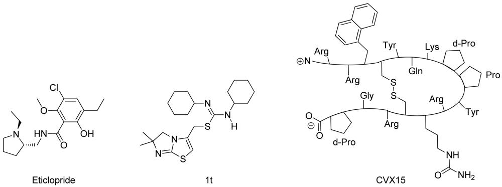 - DeMarco, S.J.; Henze, H.; Lederer, A.; Moehle, K.; Mukherjee, R.; Romagnoli, B.; Robinson, J.A.; Brianza, F.; Gombert, F.O.; Lociuro, S.; et al. Discovery of novel, highly potent and selective [beta]-hairpin mimetic CXCR4 inhibitors with excellent anti-HIV activity and pharmacokinetic profiles. Bioorg. Med. Chem. 2006, 14, 8396–8404. [Google Scholar]