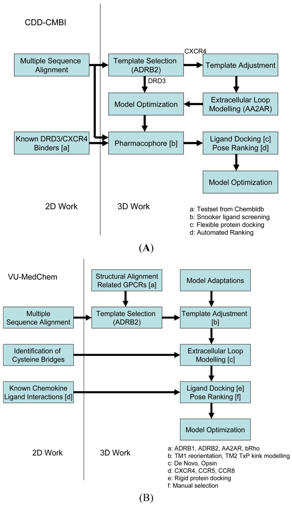 Our two research groups have taken different approaches to construct the structural models for the challenge. The CDD-CMBI group contested in both small ligand challenges and ranked second for the dopamine D3 receptor and fourteenth for the chemokine CXCR4 receptor, whereas the VU-MedChem group only contested in the CXCR4-1t challenge for which they obtained first rank [6]. The CDD-CMBI group chose to combine sequence conservation knowledge with the placement of a pharmacophore definition as a description for the protein-ligand interactions in space (Figure 2A). In parallel, a homology model was constructed based on a template structure, which was subsequently combined with the pharmacophore and flexible receptor docking to obtain a structural model for the protein-ligand interactions. The VU-MedChem group constructed a structural model after which literature data was used to determine the most likely protein-ligand interactions (Figure 2B). Each of the steps taken by our groups is graphically outlined below.