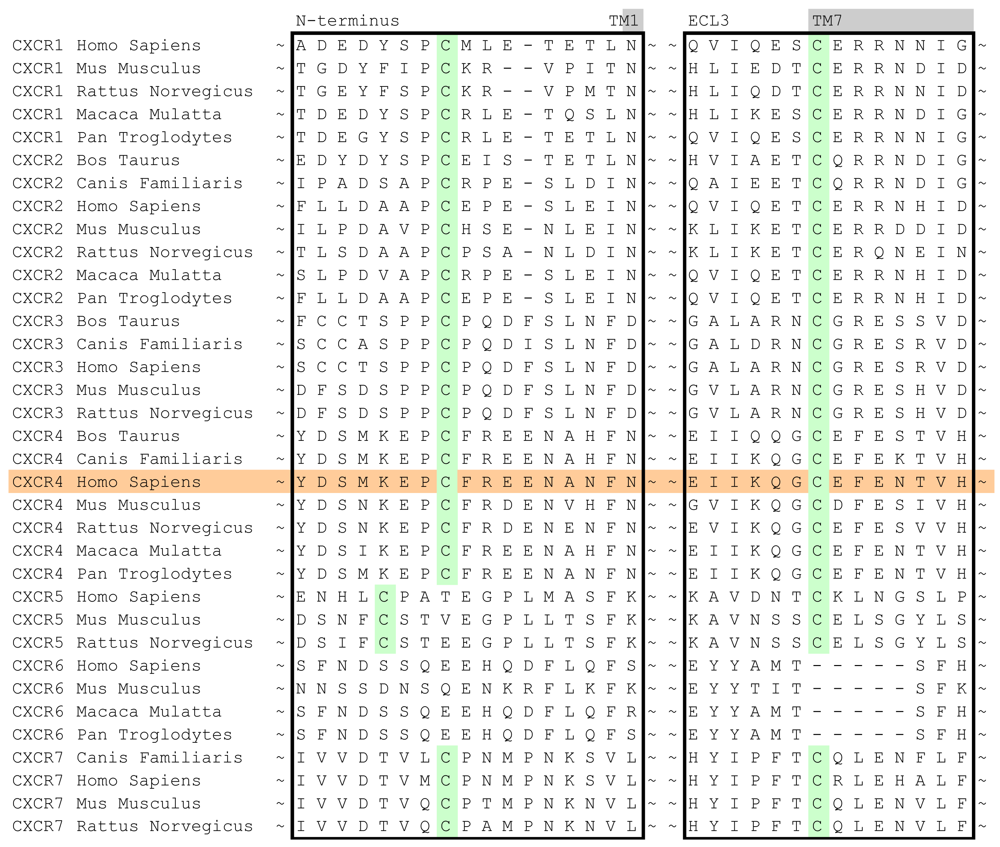 - Veldkamp, C.T.; Seibert, C.; Peterson, F.C.; de la Cruz, N.B.; Haugner, J.C., III; Basnet, H.; Sakmar, T.P.; Volkman, B.F. Structural basis of CXCR4 sulfotyrosine recognition by the chemokine SDF-1/CXCL12. Sci. Signal. 2008, 1, ra4. [Google Scholar]