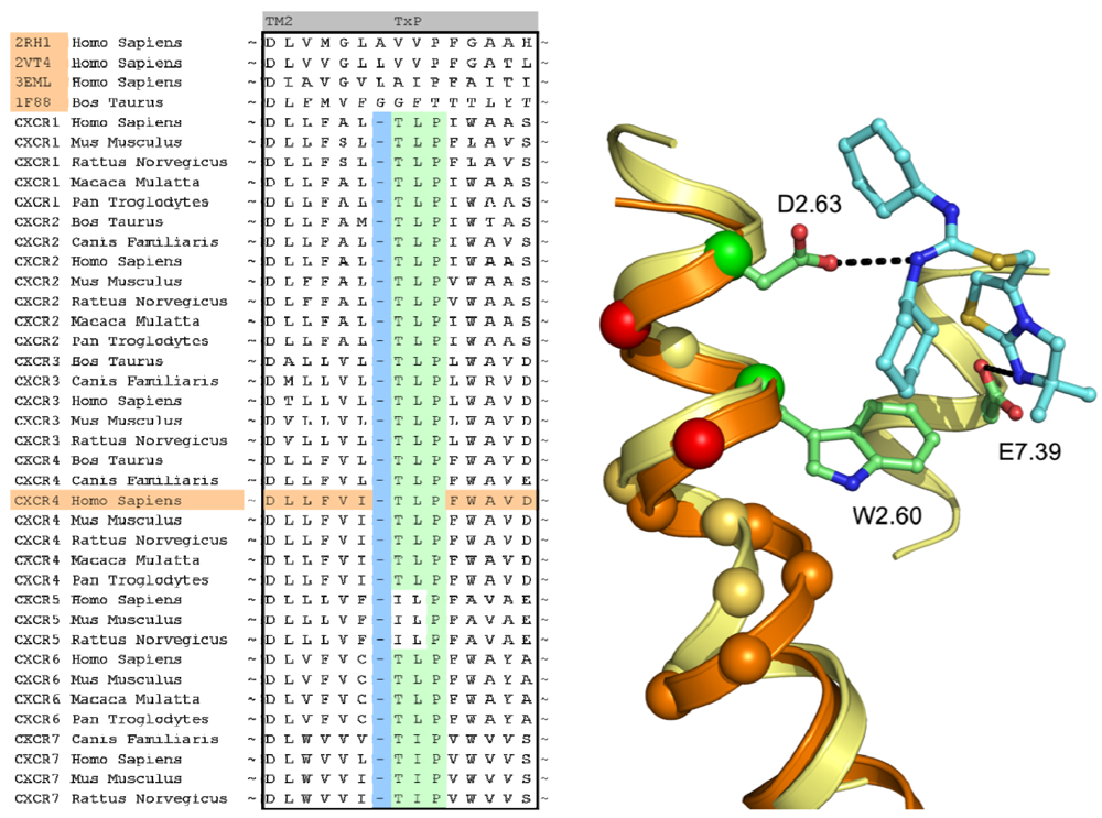 Resulting from a knowledge-based investigation of the CXCR sequence, the CXCR4 model required a template adjustment in TM1 and TM2 to accommodate an expected cysteine bridge in the N-terminus as well as a kink in TM2. Inclusion of such detail resulted in a highly customized CXCR4 model which was able to correctly capture the most important protein-ligand interactions as observed in the crystal structure. Without in depth sequence analysis, experimental receptor knowledge and knowledge on ligand analogues to validate and refine the ligand binding prediction, the result would not have been as successful.