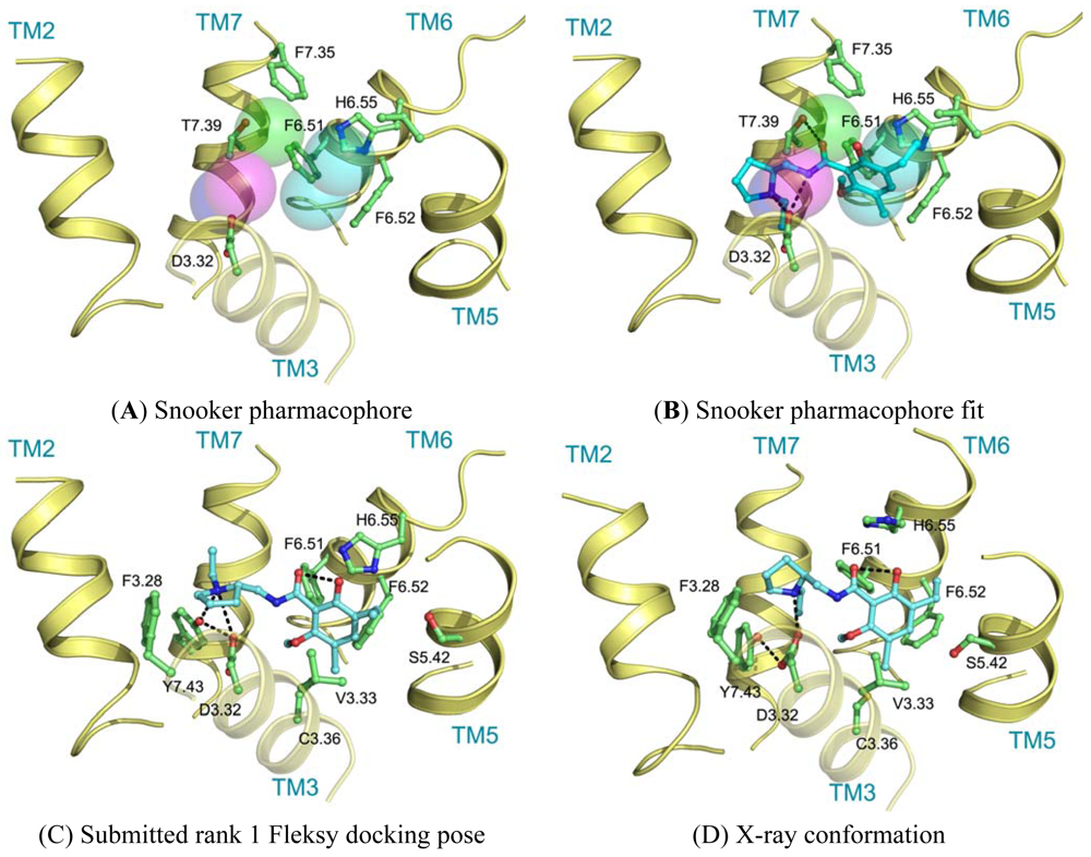 The largely automated use of extensive sequence analysis in the derivation of the structure-based pharmacophores followed by the selection of the structure-based pharmacophore best correlating to a large number of known actives, resulted in a pharmacophore definition which correctly encoded the crucial protein ligand interactions for DRD3. The simultaneous optimization of protein-ligand interactions and the protein and ligand structure themselves in a restraint docking procedure allowed that correct atomic contacts were produced and that these predicted contacts were optimized. Importantly, the applied knowledge based scoring function was able to correctly identify and assign the highest rank to the best near-native complex geometry without manual intervention.