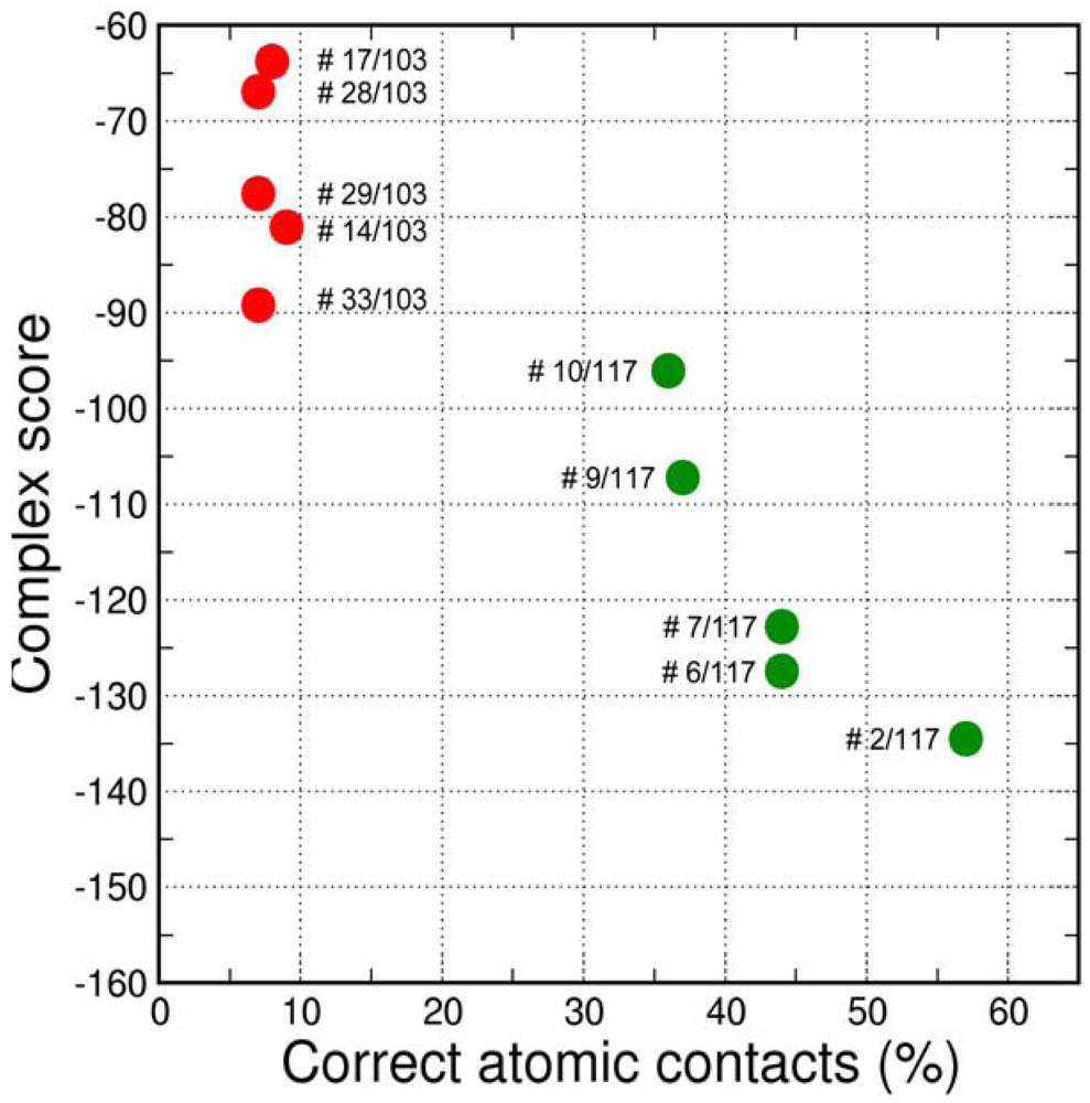 The final GPCR Dock 2010 assessment of the five submitted models placed each of them in the top 10 of all 117 submitted models with the best model ranking second. Despite a relatively high receptor model RMSD the submitted models were able to capture a large part (35% to 57%) of the receptor-ligand atomic contacts, including the hydrogen bond with D3.32 and the hydrophobic interactions with F6.51, F6.52, H6.55 and F7.35. The best binding mode was able to capture 36 of 65 atomic contacts as well as 12 of 15 residues directly interacting with the ligand. Interestingly, the accuracy of the five submitted DR3D models is in excellent agreement with the ranking generated by the Fleksy consensus scoring function [6] (Figure 6). This highlights the potential of knowledge based scoring functions in the identification of near-native receptor-ligand complex geometries. The scoring function performs less well in ranking the much less accurate solutions generated by CDD-CMBI for the CXCR4 target (Figure 6), but does correctly assign them a worse score compared to the DRD3 solutions.