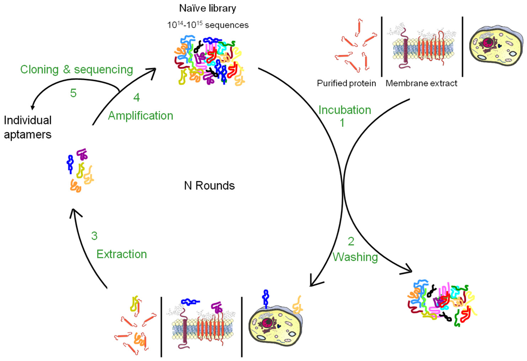 Aptamers recognize the three-dimensional structure of their targets with high specificity and the affinity is often highly dependent on the chosen conditions applied during the selection. It is therefore very important to perform the SELEX against the native conformation of the target and as much as possible in a near natural environment. Such conditions are easily provided for soluble targets but more difficult to achieve for membrane proteins whose structures are inextricably linked to their inclusion in lipidic bi-layers as well as their interaction with the intra- and extracellular matrix. Although several aptamers have been successfully selected against purified cell surface carbohydrates or recombinant ectodomains of membrane proteins, the three-dimensional structure of a purified cell surface biomarker can be rather different from the one found in the context of a plasma membrane. Therefore, aptamers selected against purified domains of membrane proteins are sometimes unable to bind the natural protein expressed at the cell surface. To bypass this drawback, several new methods of SELEX have been developed to allow aptamer selection under conditions as close as possible to the natural situation (Figures 1 and 2). The present review describes the different strategies that have been developed to select aptamers against cell surface biomarkers.
