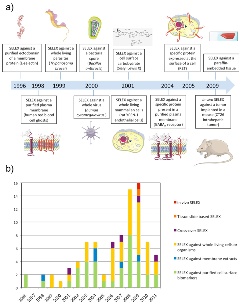 Aptamers are nucleic acid-based ligands identified through a process of molecular evolution named SELEX (Systematic Evolution of Ligands by Exponential enrichment). During the last 10-15 years, numerous aptamers have been developed specifically against targets present on or associated with the surface of human cells or infectious pathogens such as viruses, bacteria, fungi or parasites. Several of the aptamers have been described as potent probes, rivalling antibodies, for use in flow cytometry or microscopy. Some have also been used as drugs by inhibiting or activating functions of their targets in a manner similar to neutralizing or agonistic antibodies. Additionally, it is straightforward to conjugate aptamers to other agents without losing their affinity and they have successfully been used in vitro and in vivo to deliver drugs, siRNA, nanoparticles or contrast agents to target cells. Hence, aptamers identified against cell surface biomarkers represent a promising class of ligands. This review presents the different strategies of SELEX that have been developed to identify aptamers for cell surface-associated proteins as well as some of the methods that are used to study their binding on living cells.1. Introduction