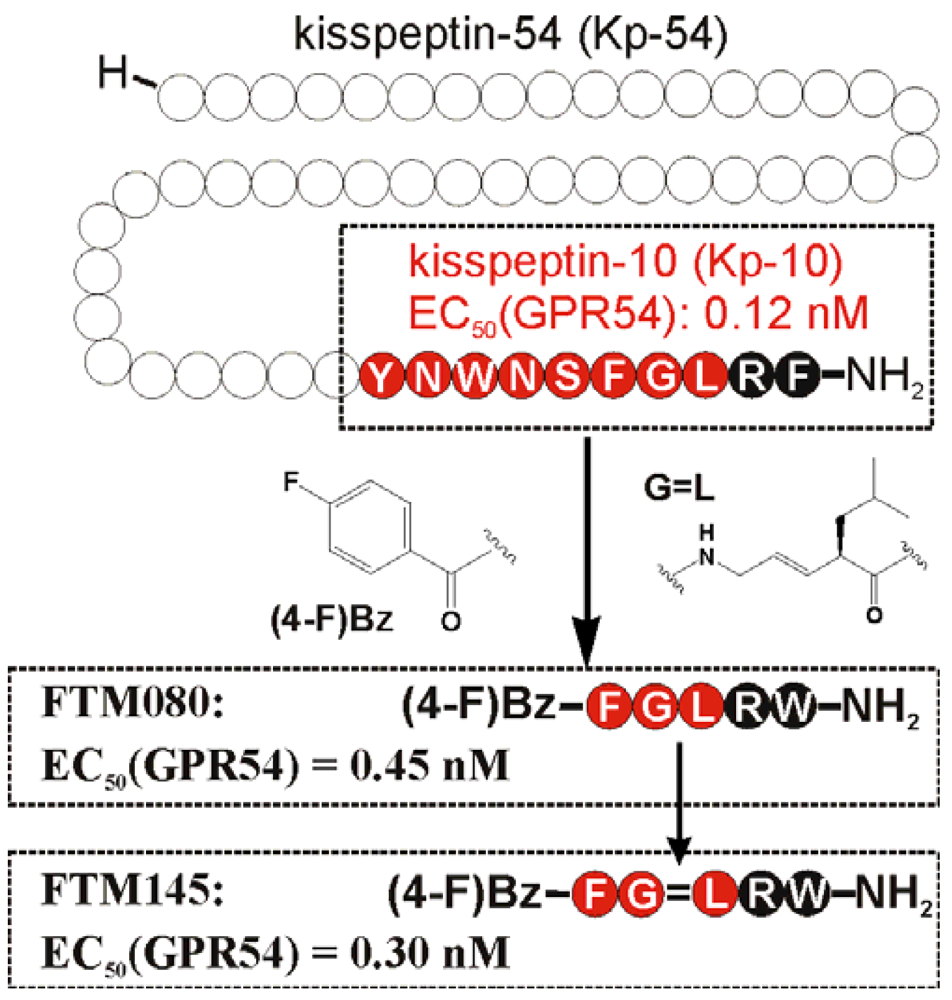 Based on this knowledge, Niida et al. developed the significantly down-sized analogs FM052a and FM053a with Kp-10 like agonistic activity (Table 8) [135]. Extensive optimization of this pentapeptide-based C-terminal kisspeptin analogs resulted in the potent kisspeptin receptor (GPR54) agonist: H-Amb-Nal(2)-Gly-Leu-Arg-Trp-NH2 (compound 34; Table 8) [134]. Further SAR and QSAR studies, performed on the N-terminal acyl groups of the pentapeptide agonists demonstrated that an aromatic acyl group and the inductive electronegative as well as small substituents at 4-position of the aromatic ring contributed to the agonistic activity. This resulted in the identification of the kisspeptin receptor (GPR54) activating agonist FTM080, which is equipotent with Kp-10 (Figure 1) [140]. The analog FTM145 was developed to prevent degradation by proteinases under physiological conditions, in which the (E)-alkene dipeptide isostere at the Gly-Leu site was inserted. FTM145 revealed a higher stability in murine serum and resistance to matrix metalloproteinase mediated cleavage as its half-life was increased up to 38 h, whereas Kp-10 was completely digested after 1 hour [139,141]. Kp-10 exhibited highly potent binding affinity and receptor activation at both NPFF receptors, whereas FTM145 and FTM080 showed reduced bioactivity toward NPFFRs, yet retaining equipotent bioactivity as Kp-10 toward kisspeptin receptor (GPR54). Highly selective agonists are as important as specific receptor antagonists for functional investigations.