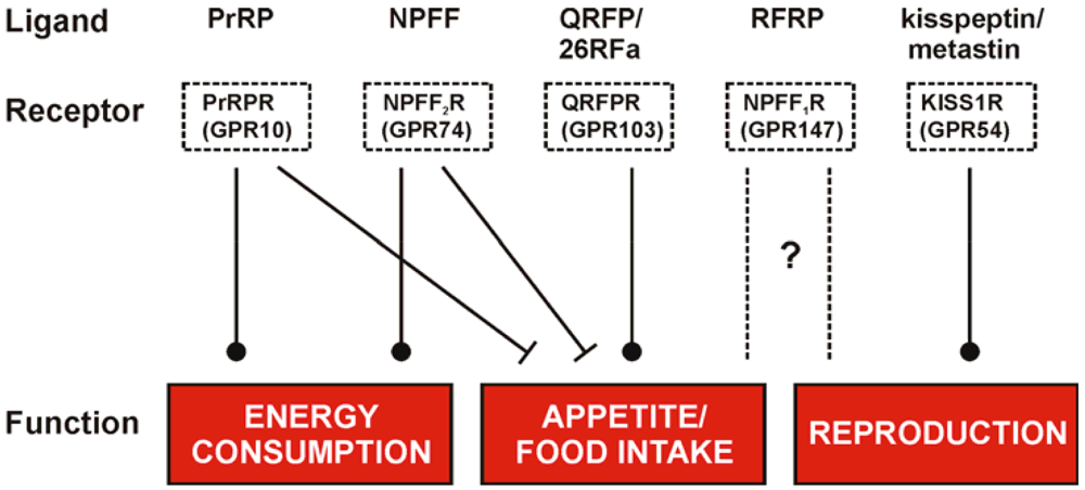 Antagonists, especially highly selective ones are a tool of choice for the investigation of distinct physiological effects mediated by single receptors and their ligands in vivo. First steps were made in the development of kisspeptin antagonists, which might provide a valuable instrument to elucidate the physiological and pathophysiological role of kisspeptin in the regulation of reproduction and could offer a unique therapeutic agent for treating hormone-dependent disorders of reproduction, including precocious puberty, endometriosis, and metastatic prostate cancer. The most advanced group of antagonistic compounds was developed for the NPFF receptor ligand system, which represents a promising target for drugs with its impact on nociception, food intake and energy expenditure. They may help to optimize the impact of opiates or improve feeding behavior. Up to now, no specific antagonists have been described for the QRFP receptor (GPR103) and the PrRP receptor (GPR10). But it has to be mentioned, that NPY dosed in the micromolar range showed some antagonistic effects for PrRP [145].