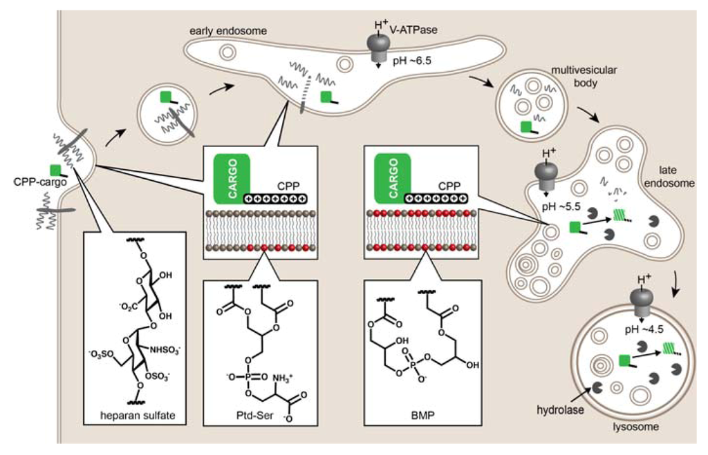 Model of the trafficking of a CPP-cargo conjugate through the endocytic pathway. From left to right: A CPP-cargo binds to HSPGs on the cell surface and induces endocytosis. Endocytosis leads to uptake and entrapment of the CPP-cargo inside an endocytic vesicle. The endosomal membrane contains the lipid phosphatidylserine (Ptd-Ser) in its outer leaflet. During endosomal maturation, a vacuolar H+-ATPase acidifies the lumen of endocytic organelles. The CPP-cargo reaches early endosomes (pH~6.5). Concurrently, hydrolases partially degrade HSPGs and release HS fragments. Upon further maturation, the CPP-cargo reaches multivesicular bodies, late endosomes (pH~5.5), and lysosomes (pH~4.5). The membrane of the intraluminal vesicles of late endosomes is enriched with BMP. HS is further degraded to smaller fragments. The CPP-cargo is susceptible to degradation due to the low pH and lysosomal hydrolases.