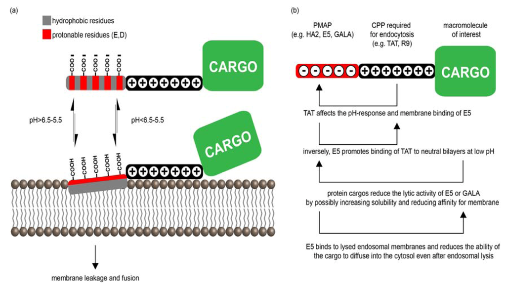 Conceptually, PMAP-CPP chimeras are designed to contain two independent functionalities: the CPP is used to induce efficient endocytosis of a cargo while the PMAP is used to increase endosomal escape. However, CPPs, cargos, and PMAPs can interact with each other as well as with membranes, and several studies have highlighted how these interactions might affect intracellular delivery (Figure 3b). As previously stated, TAT affects the apparent pKa of HA2E5 []. TAT also binds negatively charged proteins such as bovine serum albumin (BSA) while HA2E5-TAT does not []. Overall, these results indicate that HA2E5 and TAT might interact with one another in a way that alters their properties. Given that PMAPs such as HA2E5 are rich in negatively charged glutamates and that TAT is rich in positively charged arginines and lysines, electrostatic interactions between the two moieties are likely. Because TAT binds to negatively charged phospholipids, it can help bring the PMAP moiety in proximity with appropriate membranes in a pH-independent manner []. Thus, the membrane lipid composition of endocytic organelles might influence the membrane-disruptive activity of the PMAP-TAT complex by affecting the ability of TAT to interact with the membrane.