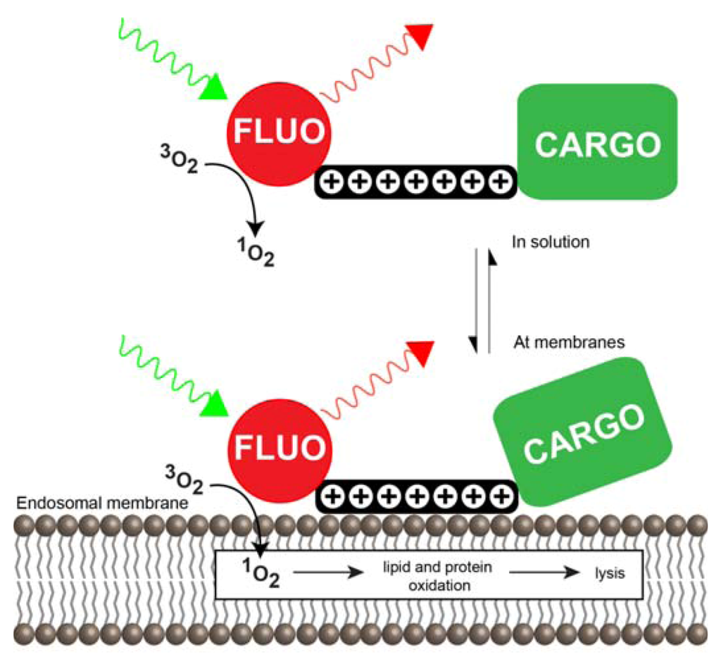 A model for fluorophore-CPP mediated PCI. The Fl-CPP conjugates exist in equilibrium in a membrane bound and unbound state due to the membrane-targeting role of the peptide moiety. Upon light irradiation, the fluorophore moiety of the conjugate produces singlet oxygen by transfer of energy from its triplet state to molecular oxygen. When present in solution, the Fl-CPP conjugate is innocuous. But, in its membrane bound state, the singlet oxygen produced by the fluorophore reacts with membrane biomolecules and disrupts the membrane, causing release of endosomal contents.
