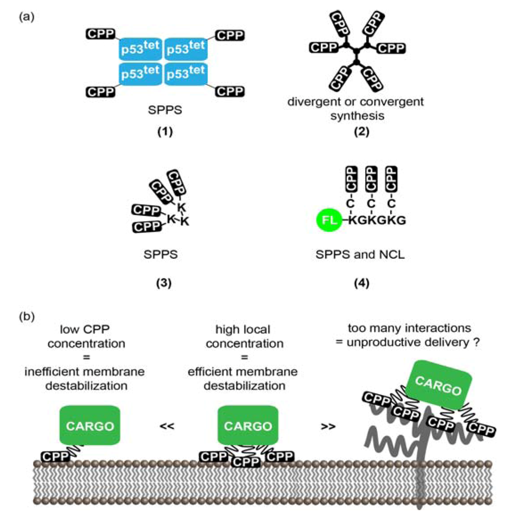 MCPPs systems and their interactions with membranes. (a) Strategies used to generate MCPPs. From left to right: (1) The p53tet-CPP system involves connecting the tetramerization domain from the human tumor repressor protein p53 to a CPP. The peptide sequence is generated using SPPS. After purification of the peptide sequence, p53tet self-assembles into a tetramer producing a tetravalent CPP. (2) Loligomers are a “squid-like” MCPP system. The CPP is attached on the surface of a polylysine branch scaffold. The scaffold and the peptide are generated using SPPS. The number of branches of this MCPP system will depend on the number of Lys coupling steps. (3) The branched CPP system involves the generation of a peptide scaffold of Lys(ε-NH-Cys)Gly repeats to which a CPP-thioester is added using native chemical ligation (NCL). The peptides were generated using SPPS although production of recombinant peptide or protein thioesters is possible using intein fusions [,]. A fluorophore was added on the N-terminal end of the scaffold peptide to serve as both an imaging agent and a small model cargo. (4) Dendrimers are MCPPs having a “tree-like” shape and are usually generated using divergent or convergent methods. CPPs have been attached to the surface of polyamidoamine (PAMAM), polypropylenimine (PPI) or polyethylenimine (PEI) dendrimers. The number of CPPs on dendrimers is among the highest observed for MCPPs. (b) Possible model of mode of action of CPPs versus that of MCPPs. In this example, a CPP-cargo is present at the membrane of endosomes at a low local concentration, leading to poor endosomolytic activity. In contrast, a MCPP-cargo displays multiple copies of the CPP. This leads to efficient membrane interactions and a possible enhancement in membrane disruption. In some cases however, too many CPP copies might cause unproductive membrane interactions such as tight binding to HSPGs. This in turn might lead to poor cellular penetration.