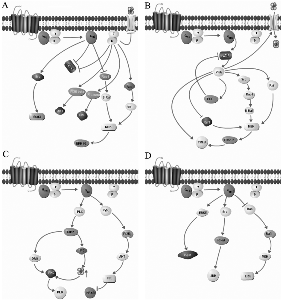 As discussed above, GPCRs respond to distinct ligands and exert an important morphological, biochemical, physiological and pathological role in a receptor selective manner. Upon activation, GPCRs couple to heterotrimeric G-proteins resulting in the dissociation of a heterotrimeric complex of Gαβγ into Gα subunit and Gβγ, which in turn activates downstream signaling via different isoforms of adenylyl cyclase (AC) [77,78,79,80]. Studies have shown the vast diversity following interaction between GPCRs and G proteins in activation of various signaling pathways [79]. Heterotrimeric G-proteins are generally classified into four families based upon the similarity in amino acid sequences: Gs, Gi, Gq and G12[81]. A concise description of some of the GPCRs coupling with distinct G proteins (Gi, Gs and Gq) is described in Table 2.
