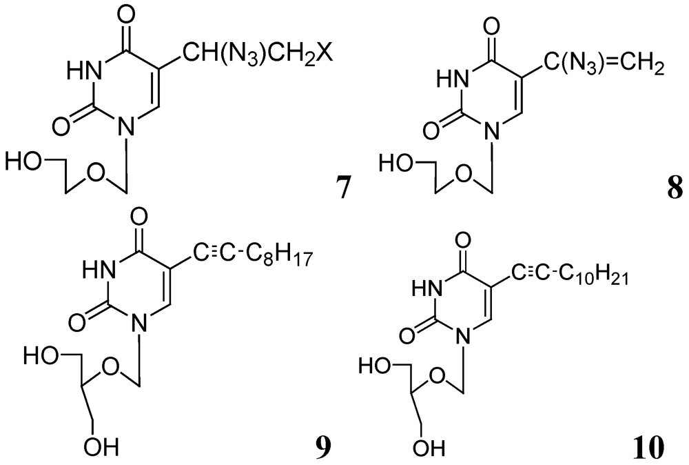 In further studies, we also investigated anti-tuberculosis activities of several 5-substituted acyclic pyrimidine nucleosides against Mtb H37Ra, M. bovis, and M. avium. In this study, 7–10 were moderately active against these mycobacteria [55] (Figure 3).