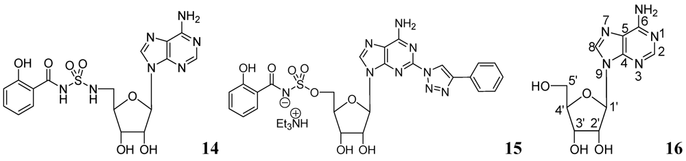 Adenosine (Ado) kinase is a purine salvage enzyme that phosphorylates adenosine to adenosine-monophosphate. A number of adenine nucleosides 16 have been evaluated as substrates and inhibitors of adenosine (Ado) kinase from Mtb. The best substrates were found to be 2-aza-adenosine, 8-aza-9-deazaadenosine and 2-fluoroadenosine, while the most potent compounds were N-1-benzyladenosine (Ki = 0.19 μM), 2-fluoroadenosine (Ki = 0.5 μM), 6-cyclopentyloxy purine riboside (Ki = 0.15 μM) and 7-iodo-7-deazaadenosine (Ki = 0.21 μM). Several of these adenosine analogs exhibited promising MICs [62] (Figure 5).
