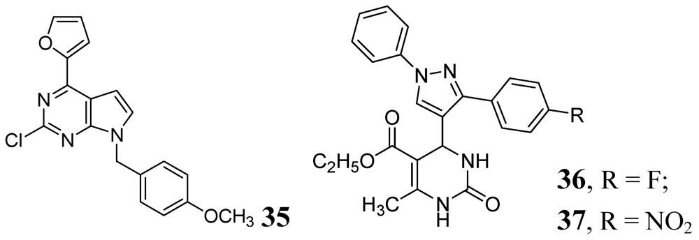 Various purine analogs were synthesized by Khoje et al. Compound 35 emerged as the most potent in the series (MIC 0.11 μM). The five most active compounds of the series were also evaluated against a panel of drug-resistant Mtb strains, where all of them retained activity. However, these compounds did not show good activity against non-replicating Mtb [76]. A series of dihydropyrimidines was examined by Trivedi et al. in 2010. Compounds 36 and 37 were the most potent in the series (MIC of 0.02 μg/mL) [77] (Figure 11).