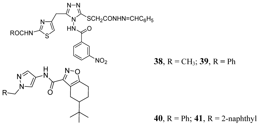 Many publications have emerged on azoles for anti-TB activity. Some good representatives of this class are described below. In this class, compounds 38 and 39 demonstrated MICs of 0.78 and 0.39 μM, against Mtb H37Rv respectively [78]. Pantothenate is a key precursor of coenzyme A and acyl carrier protein, essential for many intracellular processes. The PS pathway is not present in humans. Velaparthi et al. reported in 2008 compounds 40 and 41 (Figure 12) as the best inhibitors (IC50 of < 100 nM) [79] (Figure 12).