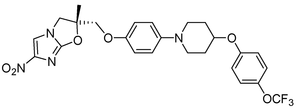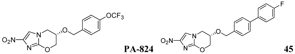 - Palmer, B.D.; Thompson, A.M.; Sutherland, H.S.; Blaser, A.; Kmentova, I.; Franzblau, S.G.; Wan, B.; Wang, Y.; Ma, Z.; Denny, W.A. Synthesis and structure-activity studies of biphenyl analogues of the tuberculosis drug (6S)-2-nitro-6-{[4-(trifluoromethoxy)benzyl]oxy}-6,7-dihydro-5H-imidazo[2,1-b][1,3]oxazine (PA-824). J. Med. Chem. 2010, 53, 282–294. [Google Scholar]