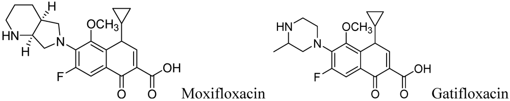 Fluoroquinolones have been used as antibiotics (e.g., ciprofloxacin, levofloxacin, ofloxacin). Moxifloxacin and gatifloxacin from this class are in Phase III clinical trials for tuberculosis treatment.
