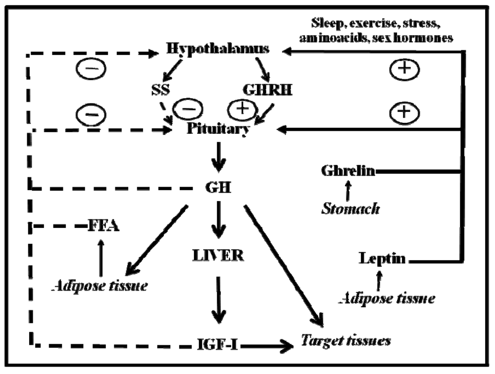 GH is a polypeptide that is secreted primarily from the somatotrophs within the anterior pituitary gland. In addition to the pituitary gland, GH is produced in extra-pituitary tissue, which indicates that GH has local paracrine-autocrine effects that are distinct from its classic endocrine-somatotropic effects [27]. The regulation of pituitary GH secretion involves a complex neuroendocrine control system that includes the participation of several neurotransmitters and the feedback of hormonal and peripheral (metabolic) factors [28]. Figure 1 shows that GH secretion from the pituitary gland is regulated by two major hypothalamic peptides: GH-releasing hormone (GHRH) and the inhibitory hormone somatostatin (SS). The balance of these stimulating and inhibiting peptides is indirectly affected by many physiological stimulators (e.g., nutrients, sleep, exercise, thyroid hormones and sex hormones) and inhibitors (e.g., glucocorticoids, Insulin-like Growth Factor (IGF)-I, GH). The final integration of these signals occurs in the hypothalamus. Pituitary GH secretion is reduced mainly by the negative feedback of two circulating signals: the pituitary GH itself and the liver-derived IGF-I, which is produced by the GH. In addition to hypothalamic (GHRS, SS) and endocrine (IGF-I, GH) factors, other peripheral (metabolic) factors, such as insulin, glucose, amino acids, free fatty acids (FFA), leptin, neuropeptide Y, and ghrelin, influence pituitary GH release. These factors, which appear to coordinate the metabolic status of the organism with GH secretion, are primarily related to or derived from the metabolic status of the organism; this relationship is consistent with the GH role in regulating substrate metabolism, adiposity, and growth. This role is exemplified by adiposity, which is a powerful negative regulator of GH secretion. FFA can act directly on the pituitary gland to inhibit the GH release, which is postulated to complete a feedback loop because GH stimulates lipid mobilization. In addition, adipocytes produce the hormone leptin, which, in contrast to FFA, stimulates GH secretion in rodents at the hypothalamus level [29]. Finally, ghrelin is another GH-secretory factor that is highly expressed in the endocrine cells of the stomach [30]. On the other hand, the selective lack of ghrelin receptor signaling in humans may lead to a syndrome characterized by short stature [31], and ghrelin analogs have been shown to effectively enhance serum IGF-I levels in humans [32].
