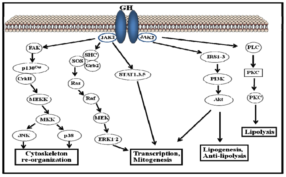 The GHR belongs to the type I cytokine receptor, a family of receptors without intrinsic kinase activity [33]. Figure 2 shows the traditional view of the initiation of GH signaling: one molecule of GH binds two GHR monomers and induces their dimerization. Through trans-phosphorylation, GH binding to the GHR results in the activation of adjacent JAK2 molecules and cytoplasmic tyrosine kinases associated with the GHR. Activated JAK2 phosphorylates the GHR on tyrosine residues, which in turn recruits members of the STAT family of transcription factors. Of the various STAT proteins (STAT 1 to 6), STAT5b has been widely associated with GH biological actions; however, STAT1, 3, and 5a have also been shown to be recruited by the GHR. STAT5 phosphorylation by JAK2 results in their dissociation from the receptor, dimerization, and translocation to the nucleus, where STAT5 modulate the transcription of the target genes (e.g., IGF-I, ALS, SOCS2, SOCS3, CIS) [34,35]. The STATs represent one of five known pathways in GH-induced signaling; other pathways include the MAPK and PI3K (Figure 2).