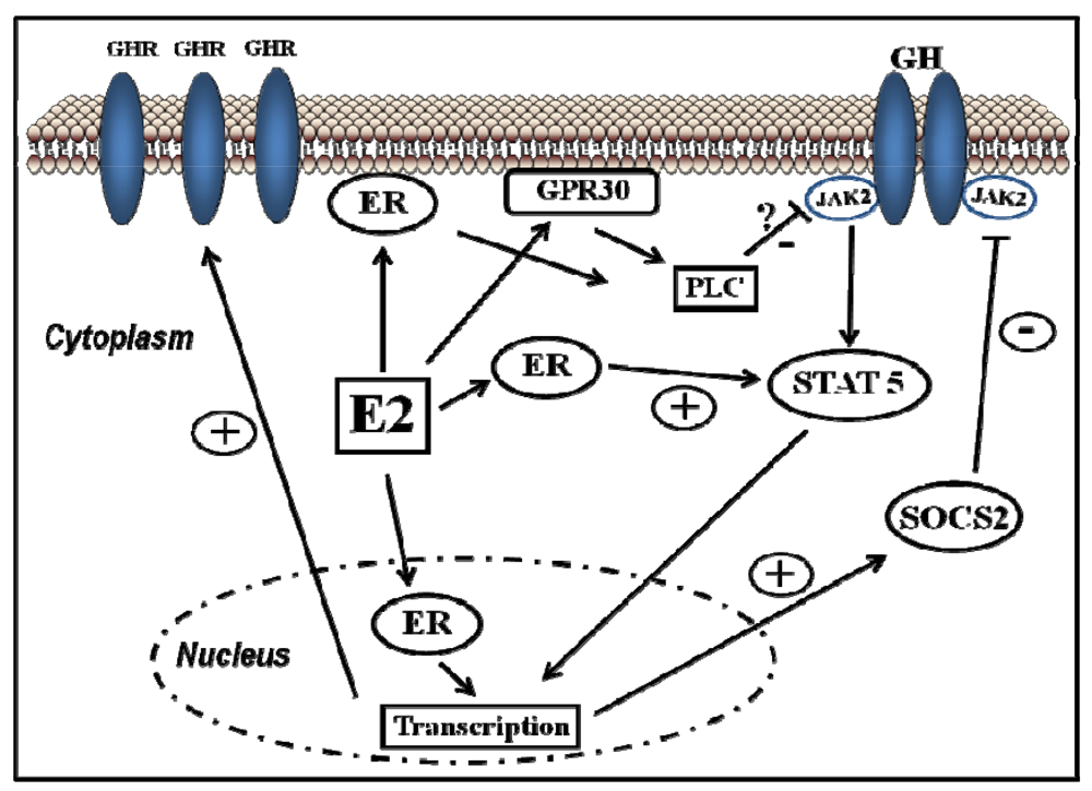 ER-subtype-selective agonists have been developed; PPT and DPN are ERα- and ERβ-selective agonists, respectively. In addition, the ERs bind a wide range of synthetic compounds with strikingly diverse structures, including selective estrogen receptor modulators (SERMs) (e.g., raloxifene). The SERMs are synthetic ER ligands that display tissue-selective pharmacology; as anti-estrogens (antagonists), they oppose the action of estrogens in certain tissues while mimicking the action of endogenous estrogens (agonists) in other tissues [70]. Environmental contaminants (e.g., polycyclic aromatic hydrocarbons, phthalates, pesticides), a class of estrogens termed xenoestrogens, and phytoestrogens also have estrogenic actions. Although their affinity for ERs is mostly 100 to 10,000 times lower than that of E2 [71], it is not questionable whether xeno- and phytoestrogens are biologically relevant in humans and farm animals. The tissue-selective expression of ERs can also determine estrogen physiology. ERα is mainly expressed in reproductive tissues, the kidney, bones, white adipose tissue, and the liver, while ERβ is expressed in the ovary, the prostate, the lungs, the gastrointestinal tract, the bladder, hematopoietic cells, and the central nervous system. Therefore, specific therapeutic actions of estrogens on tissues (e.g., the liver) may be obtained through selective ERα agonists (e.g., PPT) [72].Classical estrogen signaling occurs through the direct binding of ER dimers to estrogen-responsive elements in the regulatory regions of estrogen-targeted genes followed by the activation of the transcriptional machinery at the transcription start site [12]. Estrogen also modulates gene expression by a second mechanism in which ERs interact with other transcription factors (e.g., STAT5) through a process referred to as transcription factor crosstalk. Estrogen may also elicit effects through non-genomic mechanisms, which involve the activation of downstream kinases pathways, such as PKA, PKC, and MAPK, via membrane-localized ERs. An orphan G protein-coupled receptor (GPR)-30 in the cell membrane has also been reported to mediate non-genomic and rapid estrogen signaling. In summary, the mechanisms involved in ER signaling are influenced by cell phenotype, the target gene, and the activity or crosstalk with other signaling networks. Figure 3 shows how E2 can interact with the GHR-JAK2-STAT5 signaling pathway. E2 can modulate GH actions through changes in GHR expression or through crosstalk with the GH-activated JAK2-STAT5 signaling pathway. The ERα-dependent induction of SOCS-2 followed by the inhibition of JAK2-STAT5 signaling is a relevant mechanism that could explain how estrogens directly inhibit GH-regulated actions in the liver [15,16]. We have observed that the long-term administration of physiological doses of E2 to GH-deficient male rats (hypothyroid) can induce the mRNA expression of SOCS-2 in the liver [16]. Hypothetically, other members of the STAT family of negative regulators may contribute to estrogen interaction by GH signaling in the liver [15]. The E2 activation of ERα or ERβ followed by direct interaction between ERs and STAT5 may also regulate STAT5-dependent transcriptional activity. Paradoxically, estrogens can also activate STAT5 signaling in a pituitary manner and even in a JAK2-independent manner [55,73,74,75].