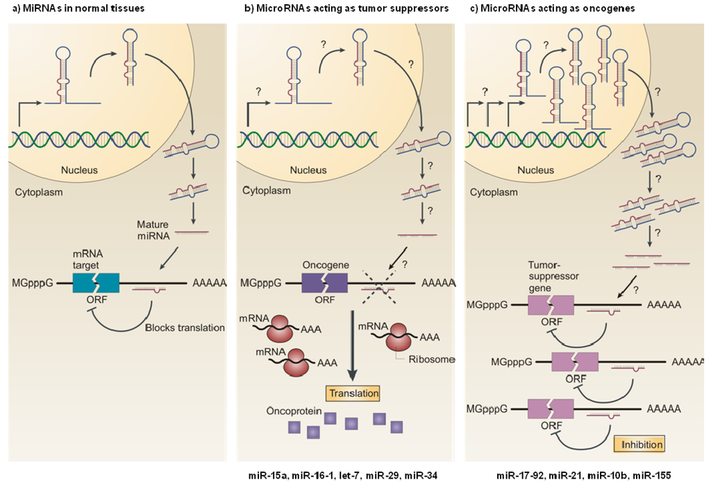 MicroRNAs as tumor suppressors and oncogenes. (a) In normal cells, miRNA transcription, processing and binding to complementary sequences in the target mRNA lead to the repression of their target genes, by either mRNA translation inhibition or mRNA degradation. (b) The reduced expression of a miRNA that acts as a tumor suppressor, as a result of chromosomal deletion or defects at any stage of miRNA biogenesis (indicated by question marks) leads to the increased synthesis of the miRNA-target oncoprotein (purple squares), and ultimately to the development of an oncogenic phenotype. (c) The increased expression of a miRNA that acts as an oncogene, as a result of (among others) amplification of the miRNA gene or constitutive promoter activation (indicated by question marks), leads to the repression of a miRNA-target tumor-suppressor gene (pink), which favors the development of an oncogenic phenotype. ORF: open reading frame; mGpppG: 7-methylguanosine. Reproduced with permission from [38].