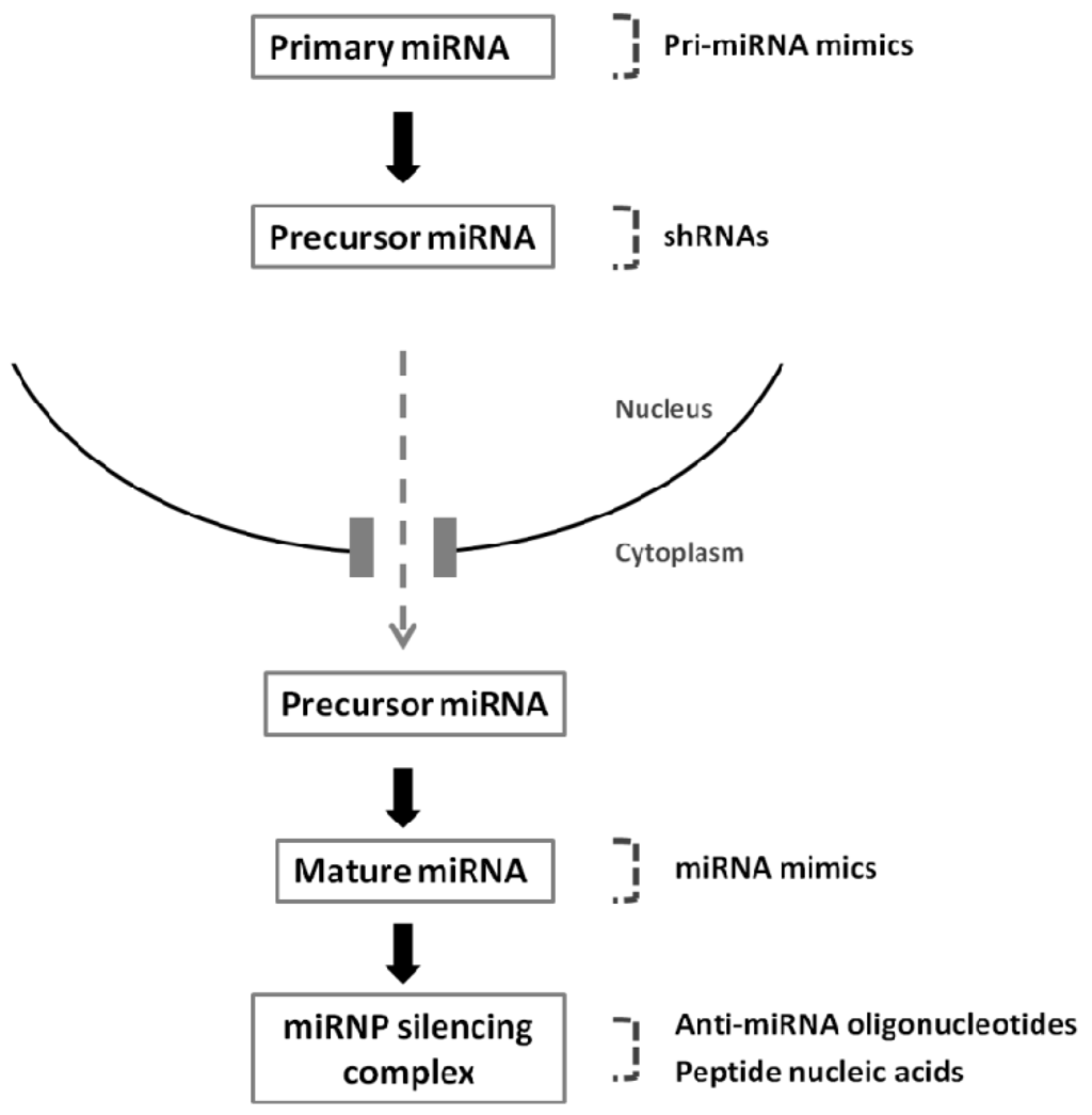 Strategies that are mostly employed to modulate miRNA expression. Constructs used to re-express or silence mature miRNAs: virally-mediated nuclear expression of pri-miRNA mimics or shRNAs, cytoplasmic delivery of double-stranded miRNA mimics, anti-miRNA oligonucleotides and peptide nucleic acids.