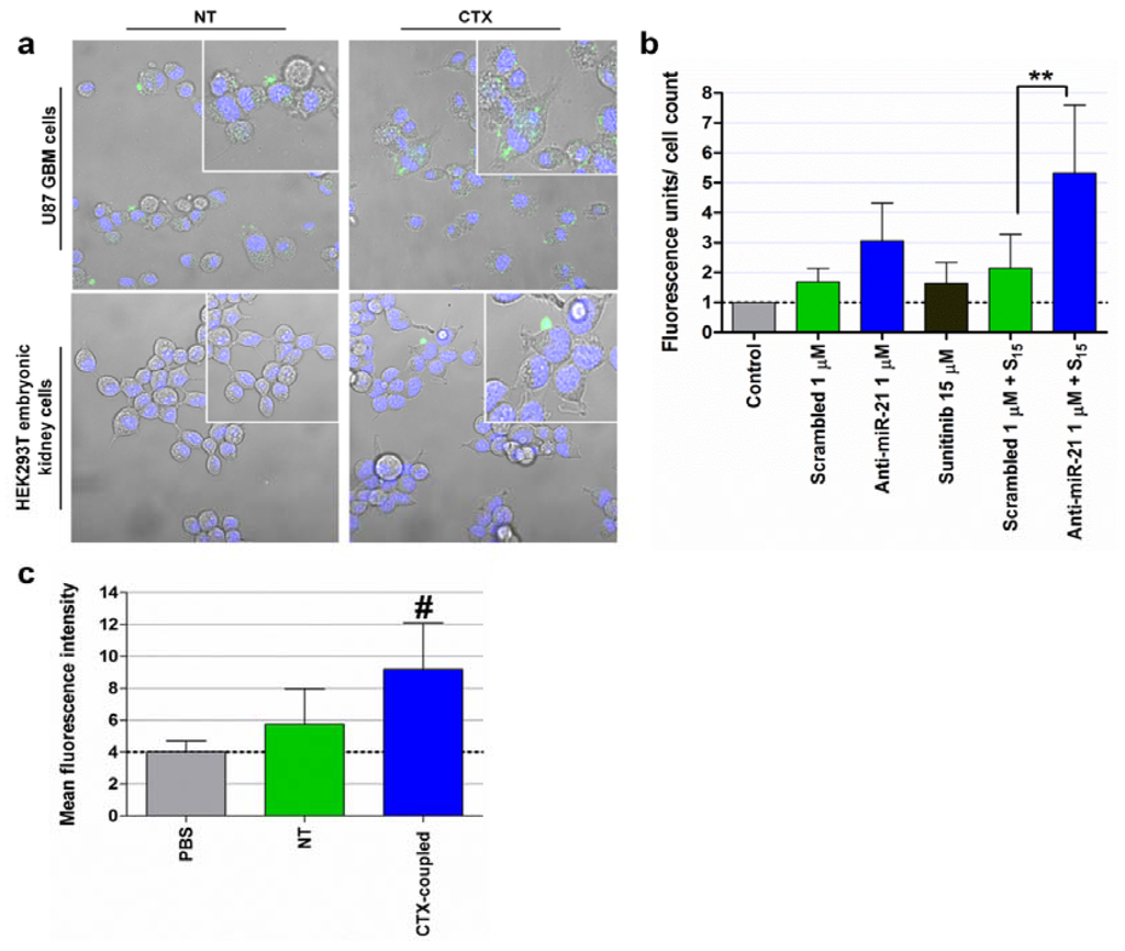SNALP internalization in human U87 GBM and HEK293T embryonic kidney cells, caspase 3/7 activation, tumor cell proliferation and biodistribution of systemically-administered SNALP-formulated FAM-labeled oligonucleotides. (a) For evaluation of SNALP internalization, U87 and HEK293T cells were incubated with CTX-coupled (CTX) or nontargeted (NT) liposomes encapsulating FAM-labeled anti-miR-21 oligonucleotides (for 4 hours at 37°C), at a final oligonucleotide concentration of 1 μM. Cells were then rinsed twice with PBS, stained with DNA-specific Hoechst 33342 (blue) and then observed by confocal microscopy. (b) For evaluation of caspase 3/7 activation, U87 cells were incubated with CTX-coupled liposomes encapsulating anti-miR-21 or scrambled oligonucleotides for 4 hours, washed with PBS and further incubated for 24 hours with fresh medium. Cells were subsequently exposed to 15 μM of sunitinib for 24 hours, rinsed with PBS, after which caspase 3/7 activation was evaluated by the SensoLyte homogenous AMC caspase-3/7 assay (AnaSpec, San Jose, CA, USA). Results, presented as relative fluorescence units (RFU) with respect to control untreated cells, were normalized for the number of cells in each condition. Scrambled/anti-miR-21 1 μM + S15: cells transfected with scrambled or anti-miR-21 oligonucleotides and further incubated with 15 μM sunitinib. ** p < 0.01 compared to cells incubated with SNALP-formulated scrambled oligonucleotides and further treated with 15 μM sunitinib. (c) Flow cytometry analysis (fluorescence intensity plots) of tumor homogenates from animals injected intravenously with CTX-coupled and NT liposomes encapsulating FAM-labeled siRNAs or saline solution (PBS). # p < 0.05 compared to animals injected with a similar amount of NT SNALP-formulated siRNAs. Results are presented as mean ± standard deviation of at least three different experiments.