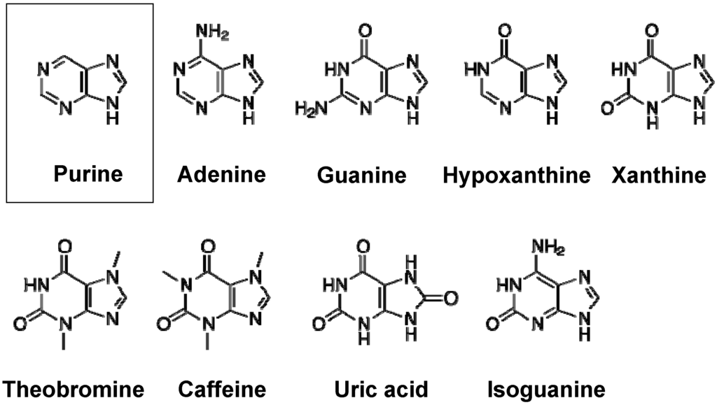 Chemical structures of purine and its derivatives, i.e., adenine, guanine, hypoxanthine, xantine, theobromine, caffeine, uric acid, and isoguanine.