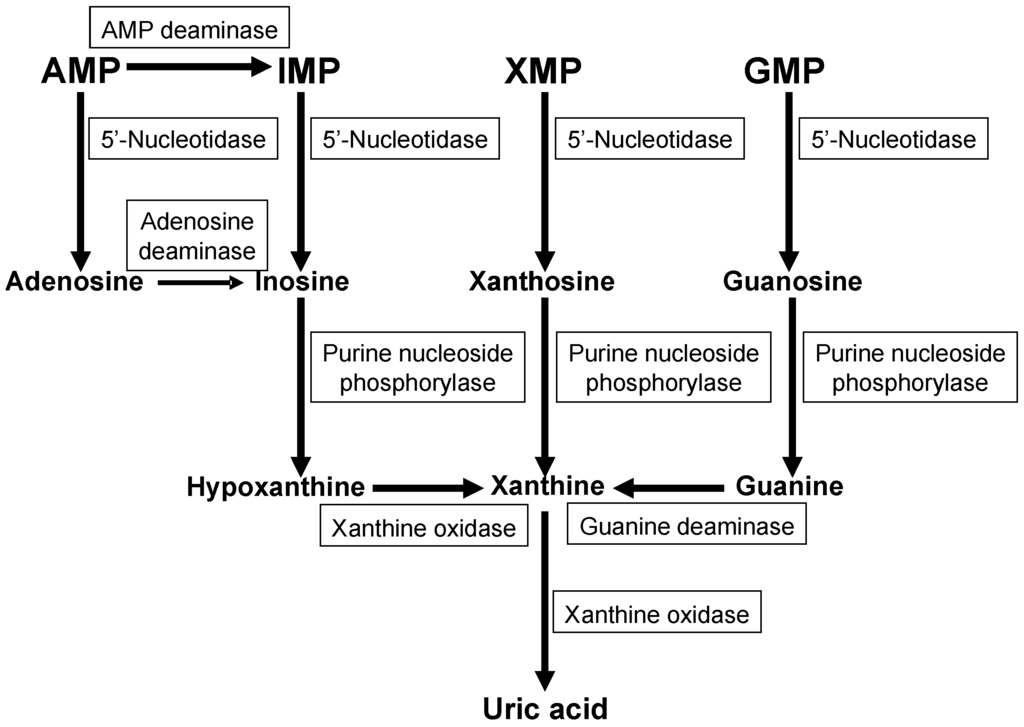 In mammals, excess purine nucleosides are removed from the body by breakdown in the liver and excretion from the kidneys. For most mammals, the purines are first converted into the intermediate uric acid, which is then metabolized by the enzyme uricase into the compound allantoin. Allantoin is a very soluble compound that can easily travel through the bloodstream, become filtered by the kidneys, and be excreted from the body. In contrast to other mammals, humans and primates lack a functional uricase enzyme, and can only break purines down into uric acid. Figure 2 depicts the metabolic pathways of purine catabolism and uric acid formation. The metabolic pathways consist of multiple steps of reactions catalyzed by various enzymes, such as AMP deaminase, adenosine deaminase, 5′-nucleotidase, purine nucleoside phosphorylase, guanine deaminase, and xanthine oxidase. In humans, uric acid is the final product of purine metabolism.