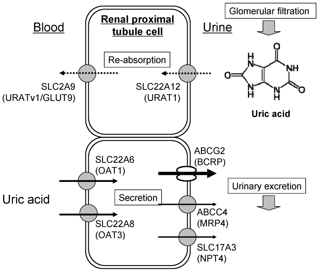 Schematic illustration of renal re-absorption and excretion of uric acid. Uric acid filtrated from the renal glomerular body is first re-absorbed by human renal proximal tubule cells. Thereafter, uric acid is eliminated, in part, from the blood circulation to urine by renal transporters. Arrows in the figure indicate the direction of transport of uric acid. Dotted and solid lines indicate re-absorption and secretion, respectively.