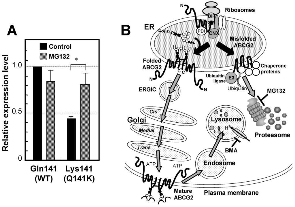 Effect of the SNP variant (Q141K) on the protein expression level and degradation of ABCG2. (A) The ABCG2 wild type (WT) protein has glutamine residue at amino acid position 141. To assess the effect of Q141K variant on the protein expression level, Flp-In-293 cells expressing WT and the Q141K variant were incubated in the absence or presence of MG132 (2 μM) for 24 h. ABCG2 WT and Q141 variant proteins were analyzed by immunoblotting with the ABCG2-specific monoclonal antibody (BXP-21) after PNGase F treatment. The glyceraldehyde-3-phosphate dehydrogenase (GAPDH) protein level was analyzed by GAPDH-specific antibody. The signal intensity ratio (ABCG2/GAPDH) was normalized to the control level. Data are expressed as means ± S.D. in triplicate experiments [33]. (B) Correctly processed ABCG2 WT protein is destined to reach the plasma membrane and is then degraded by the endosome-lysosome pathway after remaining in the plasma membrane domain for a certain period. In contrast, the ABCG2 Q141K variant protein is recognized as a misfolded form and then undergoes ubiquitination-mediated proteasomal degradation. Bafilomycin A1 (BMA) and MG132 inhibit lysosomal and proteasomal degradation, respectively.