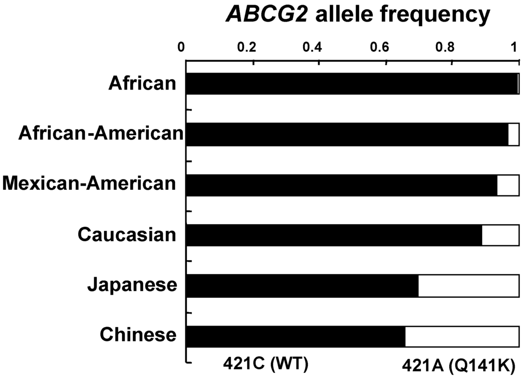 The allele frequencies of 421C (WT) and 421A (Q141K) among different ethnic populations. Data are calculated from Ishikawa et al. [36].