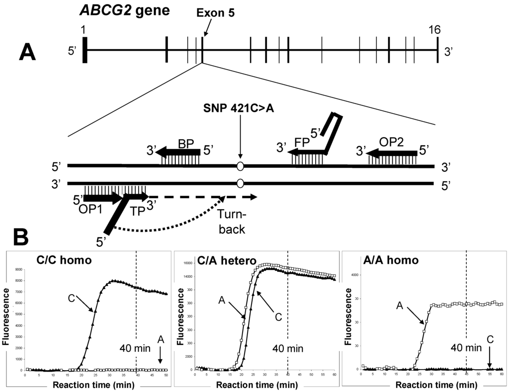 DNA polymerase reaction proceeds from the 3′-end of TP primer (see Figure 7), and the turn-back region (underline) of TP primer recognizes the nucleotide (C or A) corresponding to the position 421 in the newly synthesized DNA strand. The C-or-A recognizing nucleotide (G or T) is marked by a square in the sequence of each TP primer. The molar ratio of primers in the genotyping reaction mixture was TP:FP:BP:OP1:OP2 = 8:8:4:1:1.