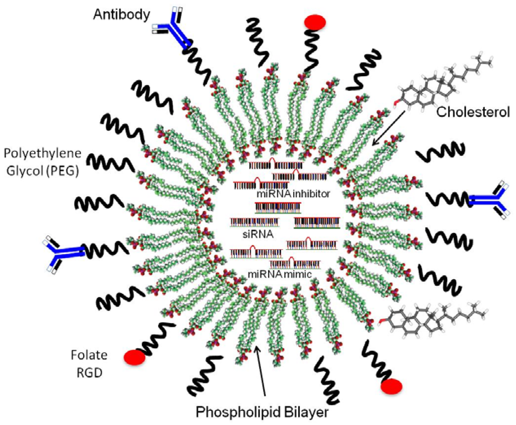 - Identification of specific receptors in the surface of cancer cells for the creation of targeted nanoparticle-RNAi delivery systems (double targeting) [125]. Targeting specific cell surface receptors is achievable by the direct conjugation of anticancer drugs with specific ligands or with the use of ligand-PEG-derivatized lipids in nanoliposomes [11,95];