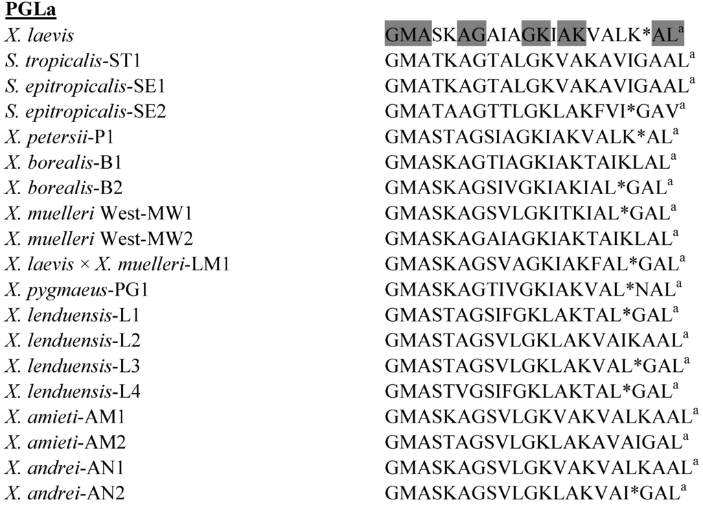 Primary structures of the peptide glycine-leucine-amide (PGLa) peptides isolated from skin secretions of frogs belonging to the genera Xenopus and Silurana. a denotes C-terminal α-amidation. In order to maximize structural similarity, gaps denoted by * have been introduced into some sequences. Strongly conserved residues are shaded.