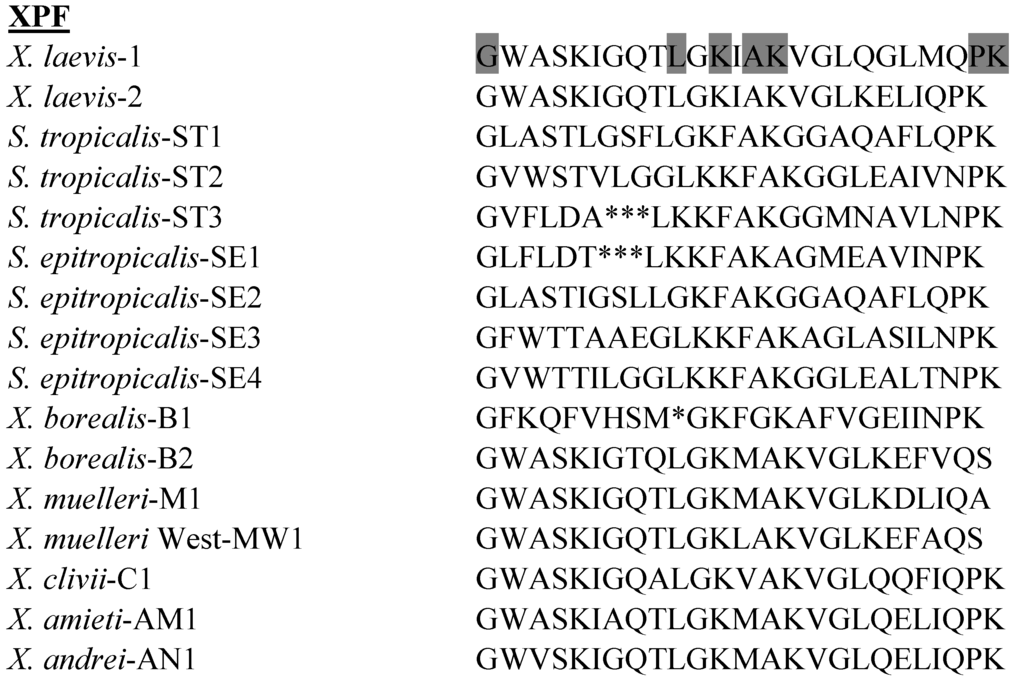 Primary structures of the xenopsin precursor fragment (XPF) peptides isolated from skin secretions of frogs belonging to the genera Xenopus and Silurana. In order to maximize structural similarity, gaps denoted by * have been introduced into some sequences. Strongly conserved residues are shaded.