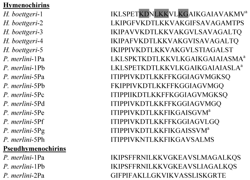Primary structures of the hymenochirins isolated from skin secretions of the frogs Hymenochirus boettgeri and Pseudhymenochirus merlini, and the pseudhymenochirins from P. merlini. a denotes C-terminal α-amidation. Strongly conserved residues are shaded.