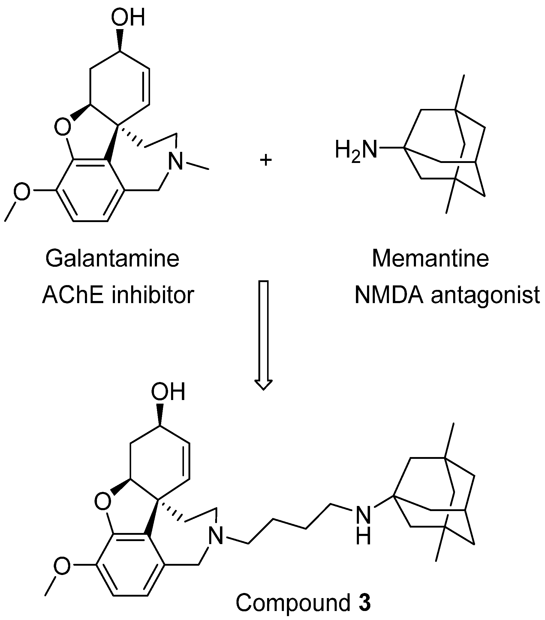 Moving forward this combination therapy is to create new neuroprotective molecules with activity against both AChE and NMDARs, which can be termed as bi/multi-target drugs. Several such attempts have been reported, and one such example was designed by the groups of Rosini and Cavalli [56]. In their research, a novel series of dual inhibitors of AChE and NMDARs were created by linking together two FAD-approved drugs galantamine and memantine (Figure 3). Among these new inhibitors, compound 3 was found to be the most potent NMDAR antagonist with a Ki of 2.32 μM while also possessing potent activity against AChE (IC50 = 0.696 μM). Although it is still difficult to balance the affinity profiles against both AChE and NMDARs, the interesting biological profile obtained from their research deserves further investigation [56].