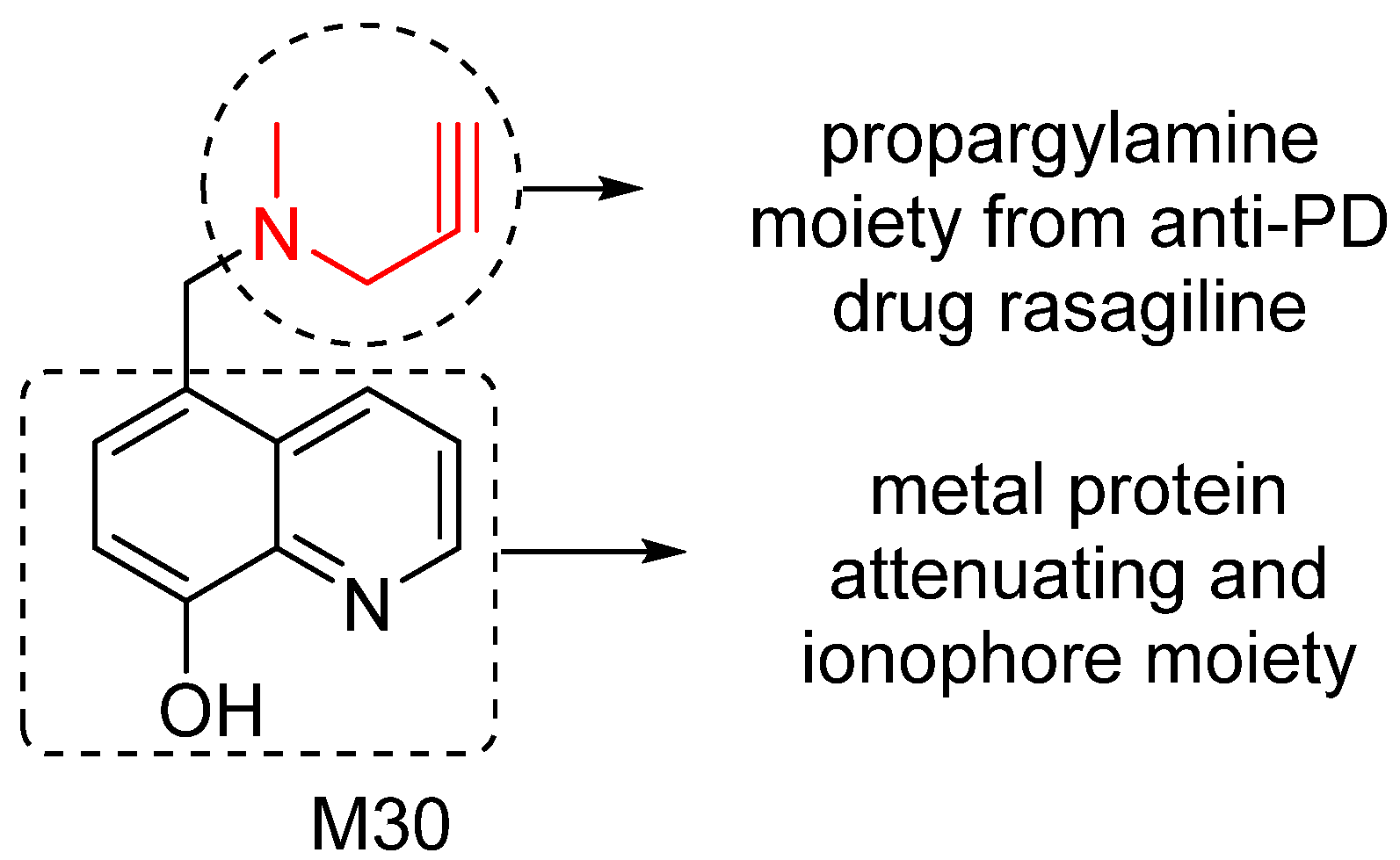 To effectively restore the network dysfunction related to metal homeostasis, oxidative stress and MAO activity in AD brain, we have designed and investigated a series of new compounds as potential multitarget/network medicines. Among them, M30 was identified as a lead compound for further development. M30 contains a key pharmacophores (propargylamine moiety) from the FDA-approved anti-PD rasagiline (Figure 4). Rasagiline is a new generation of MAO-B inhibitor used as monotherapy or adjunct therapy to levodopa for early and late PD patients. In addition, rasagiline was recently reported to be the first drug with an apparent disease-modifying effect, at a dose of 1 mg per day [64]. The propargylamine moiety in the structure of rasagiline plays a pivotal role in the disease-modifying potential of rasagiline because it mediates the interaction of rasagiline with an array of neuroprotective/neurorescue pathways [65].