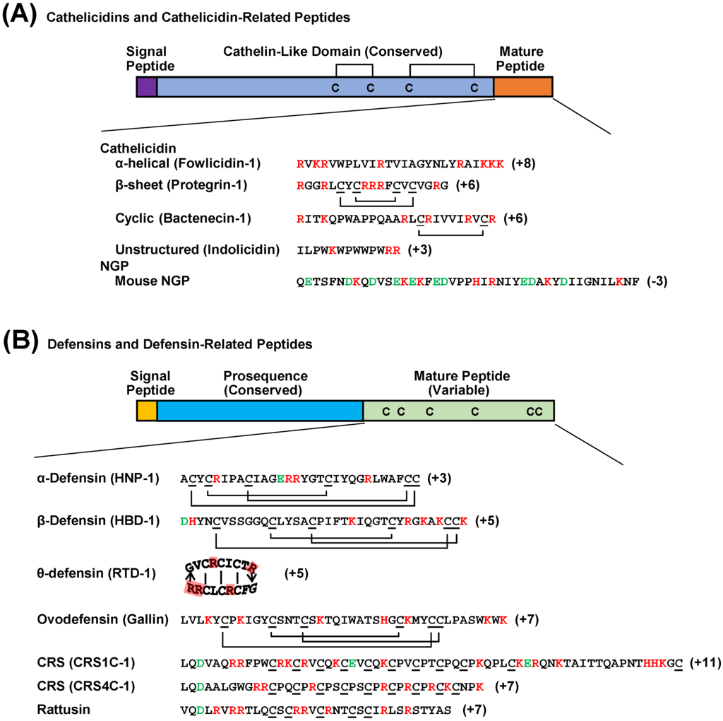 Schematic drawing of vertebrate cathelicidin and defensin precursor peptides. (A) Cathelicidins and cathelicidin-related peptides known as NGPs are highly conserved in the cathelin-like domain that contains two disulfide bridges. Unlike cathelicidins whose C-terminal segments are highly variable across species and proteolytically cleaved from the cathelicidin-like domain to become biologically active, NGPs are conserved throughout the entire sequence and functionally active without being processed. (B) The defensin family includes classical α-, β-, and θ-defensins with indicated disulfide bonds as well as four subfamilies of defensin-related peptides with unknown disulfide bonding patterns. Avian-specific ovodefensins contain six cysteines but with a different spacing pattern from that of classical defensins. Rodent-specific CRS1C, CRS4C, and rattusin also exist with 11, 9, and 5 cysteine residues, respectively, that presumably form intermolecular disulfide bonds. Positively and negatively charged amino acids are indicated in red and green, respectively.