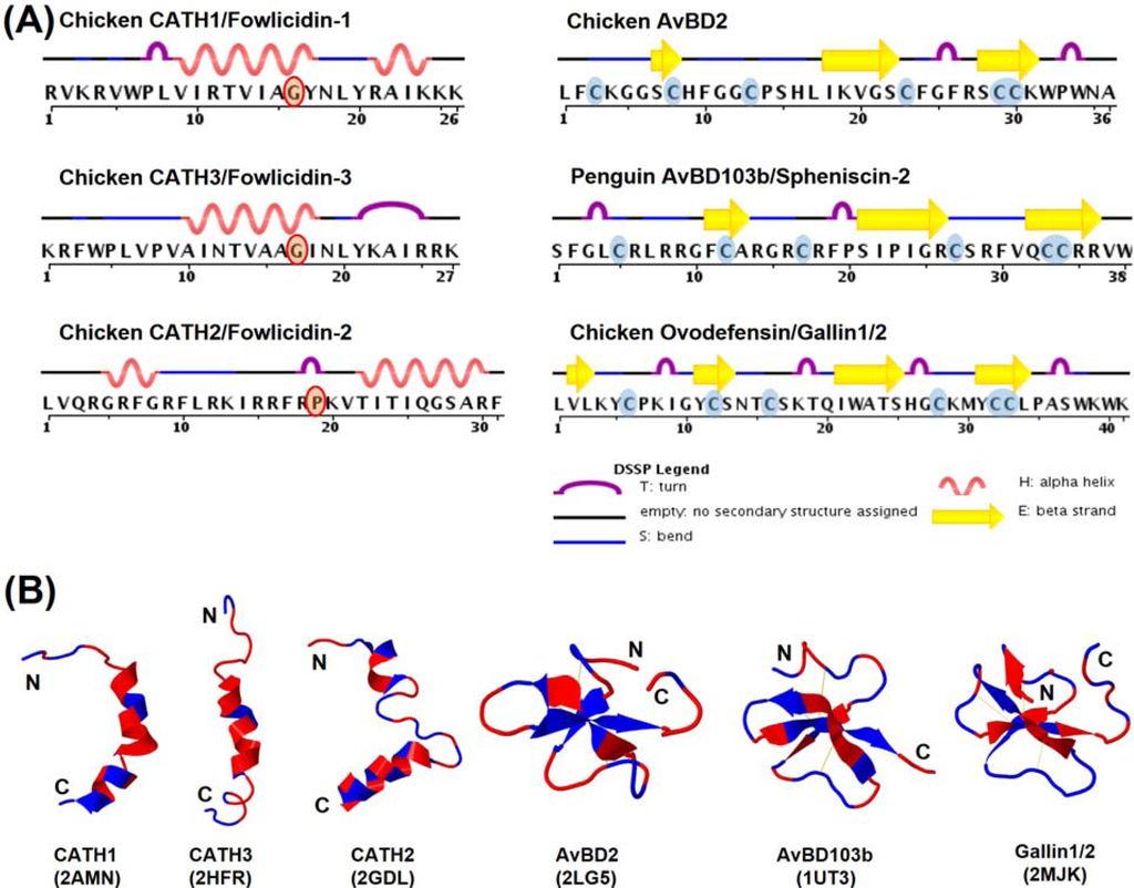 Structures of avian cathelicidins and β-defensins. (A) Secondary structural features of cathelicidins and β-defensins. (B) Tertiary ribbon structures of cathelicidins and β-defensins. Polar residues are indicated in blue and nonpolar residues in red. Disulfide bonds of β-defensins are shown in yellow. Protein Data Bank identification number for each molecule is indicated in parenthesis.
