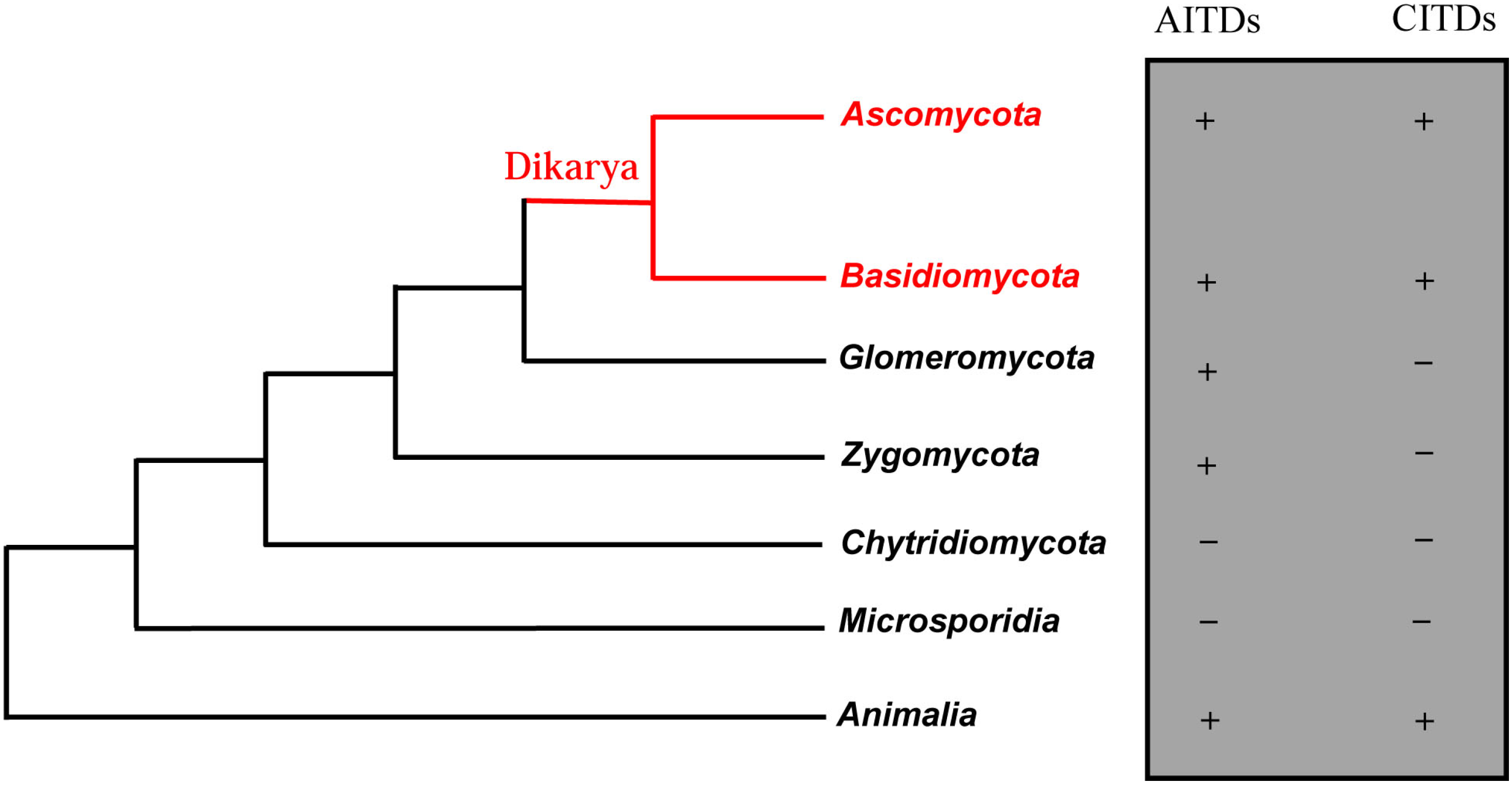 Phylogenetic distribution of fDLPs. The left: A parsimony tree of fungal species, animalia is used as an outgroup. This tree is a modification of the SSU and LSU r-RNA analyses of Lutzoni et al. for the fungal kingdom [10]. The right: “+” means presence and “−” means absence.