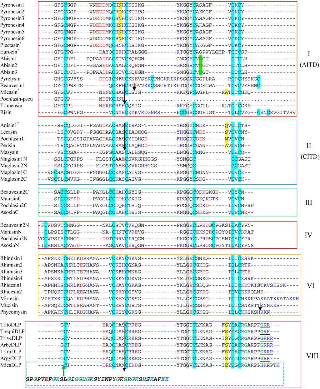 Multiple sequence alignment of fDLPs. Cysteines are shadowed in cyan. Conserved glycines are highlighted in grey. Negatively (D and E) and positively (R, K and H) charged residues are boldfaced in red and blue, respectively. Introns are shown by arrows (phase 0) or small boxes (green: phase 1, yellow: phase 2). Functionally characterized fDLPs were indicated by “*”. The N-terminal extension sequence in micaDLP belonging to the family fDEF8 is italicized. Defensins from Pyronema omphalodes have been predicted and investigated by RNA-seq [13]. Extra residues for C-terminal amidation are underlined once.
